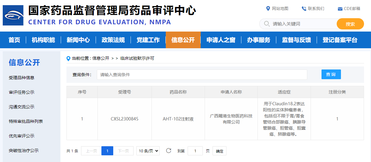 近日,廣西鷺港生物醫(yī)藥科技有限公司(以下簡稱“鷺港生物”)研發(fā)的AHT-102注射液通過國家藥品監(jiān)督管理局臨床默示許可(受理號:CXSL2300845)。AHT-102注射液是針對熱門腫瘤靶點Claudin18.2的生物制品創(chuàng)新藥,主要適應(yīng)癥為胃癌和胰腺癌。