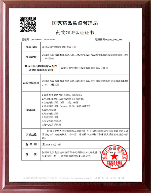 湖北天勤生物武漢分公司(安全性評價中心)是湖北省第一家民營GLP研究機構,現有一支近300人的專業技術團隊,具備了開展中國NMPA、美國FDA項目的質量管理體系和資質,同時通過了國際AAALAC完全認證。公司目前擁有超過10000m2 的設施,可開展嚙齒類和非嚙齒類的單次給藥、重復給藥、生殖【大鼠I、II和III段;小鼠I、II和III段;兔II和兔III段;伴隨食蟹猴(性成熟)重復給藥毒性試驗的生育力評價研究、食蟹猴伴隨胎盤屏障和血乳屏障的EFD試驗和增強的圍產期發育(ePPND)毒性試驗】、遺傳毒性(Ames、微核和染色體畸變)、免疫原性、安全藥理、局部刺激、毒代動力學和致癌等9項GLP試驗以及藥效、藥代動力學、毒性探索性試驗(DRF)等,尤其在生物制品、化藥和中藥和兒科用藥等方面擁有大量的非臨床評價經驗和成功案例,同時在上述藥物的生殖與發育毒性試驗設計、結果判定等方面積累了寶貴的經驗;建立了國內領先的食蟹猴生殖毒性與發育毒性研究平臺,是國家科技部重大創新藥制科技重大專項的藥物安全性評價示范平臺之一。